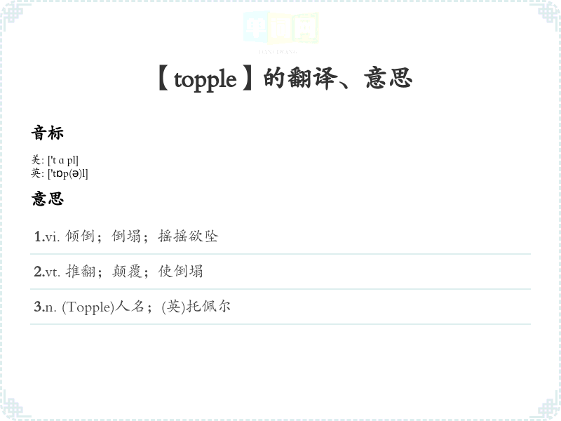词源分析:该词源自古英语“topian”,意为“使……翻倒”,其根源可以追溯到古法语“toppler”,意为“倾斜”。其词根“top-”与“倾斜”相关,后缀“-ple”表示动作或过程。