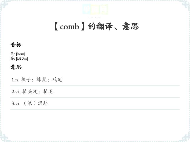 - Comb的发音是/kɒm/或/koʊm/(美式),通过发音记忆与“come”相似联想,帮助记忆其意义。
