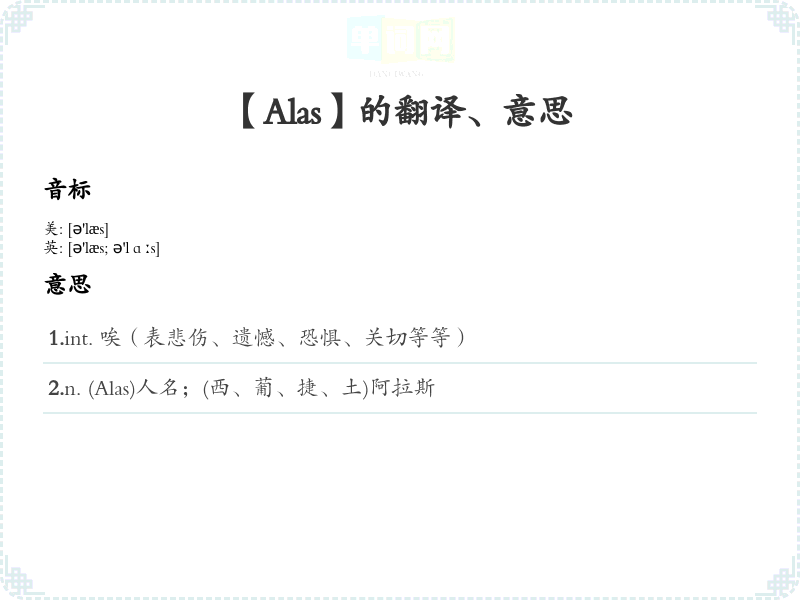 - Alas /əˈlæs/。可以通过将其分解为音节来记忆,强调“a”和“las”的发音。联想悲伤或失望的情景,如“ah!”表示叹息的声音,帮助记忆。