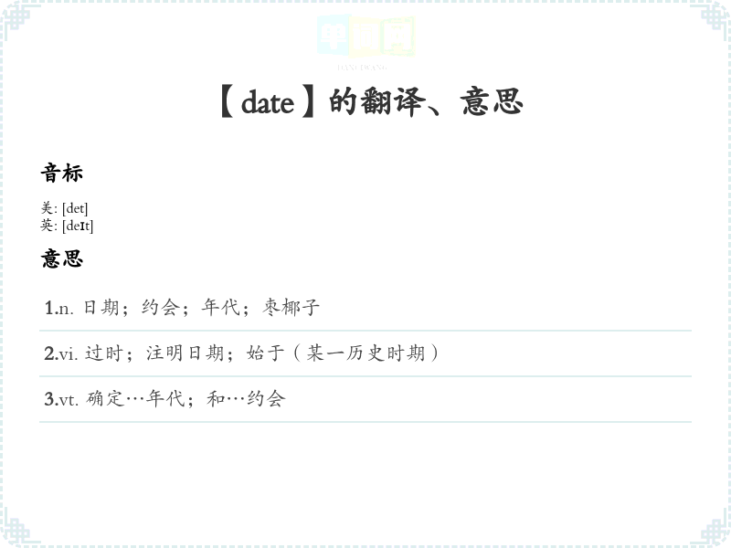 - 音标记忆法:将“date”发音为 /deɪt/,可以联想到“待”,即等待某个特定的日子到来。