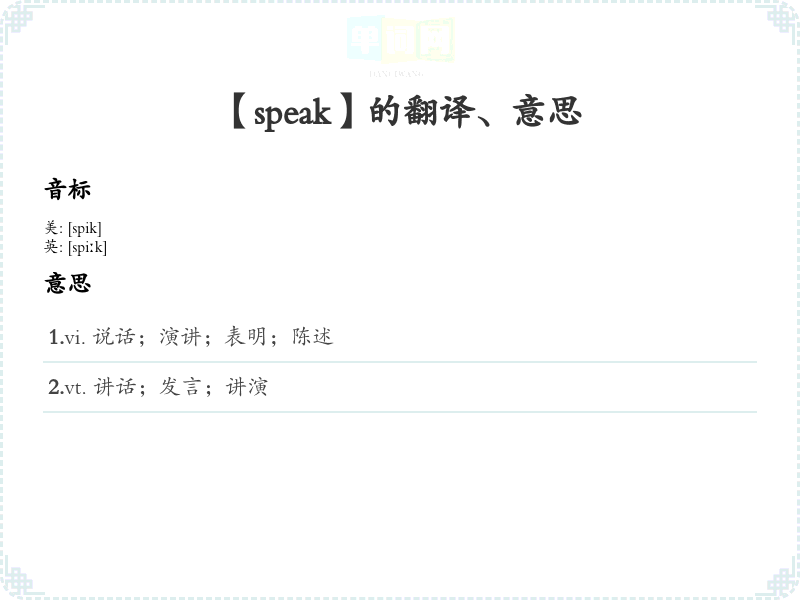 1.vi. 说话;演讲;表明;陈述 2.vt. 讲话;发言;讲演