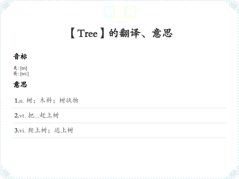 - 音标记忆法:Tree的音标是 /triː/,可以通过反复朗读来加深记忆,联想“树”像一个直立的字母“T”。