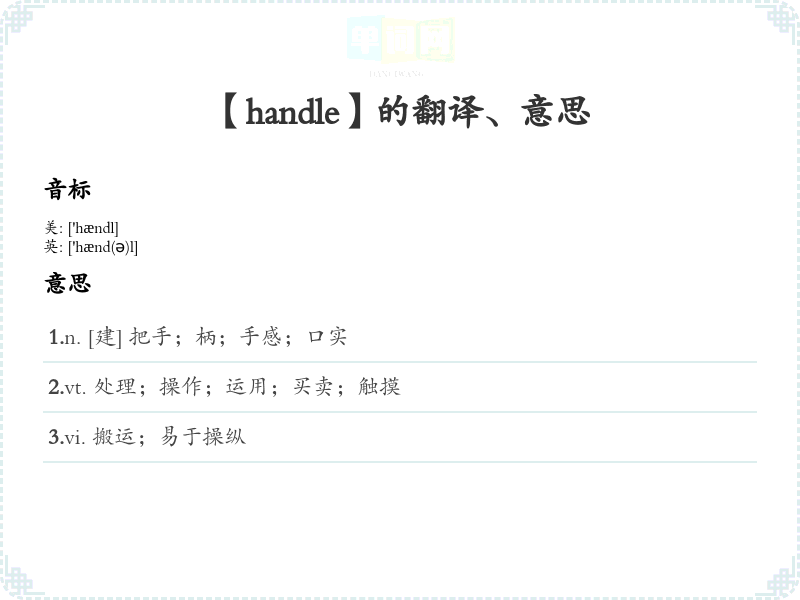 “handle”可以谐音为“汉德”,想象成“用手处理汉字”的场景,帮助记忆。