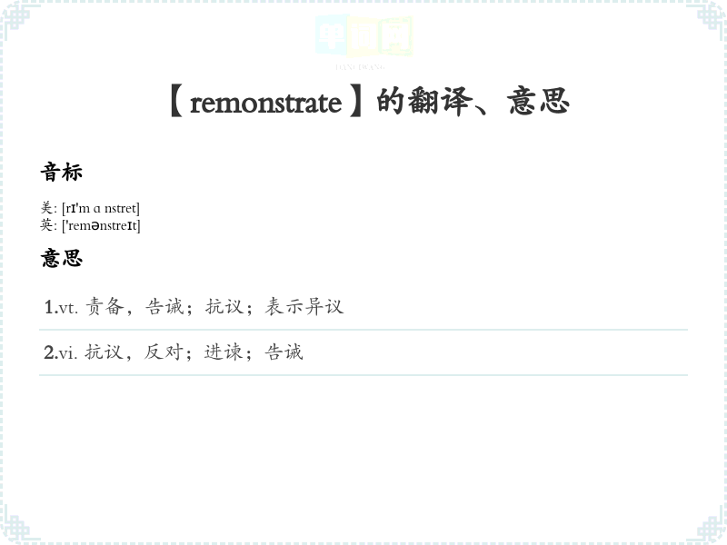 remonstrate的字面含义是“反对、抗议或表示异议”。 - 定义:作动词使用,指以强烈的方式表达反对意见或抗议,通常是通过口头或书面形式。