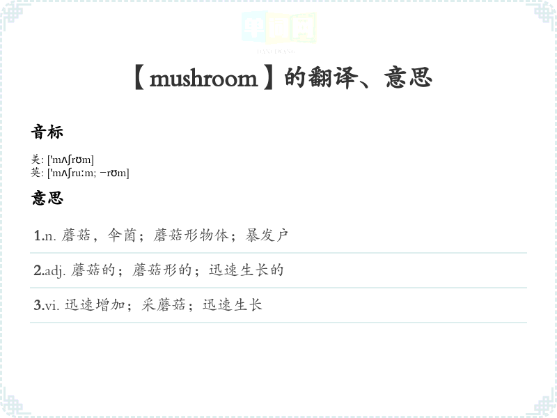【mushroom】是什么意思、字义解释