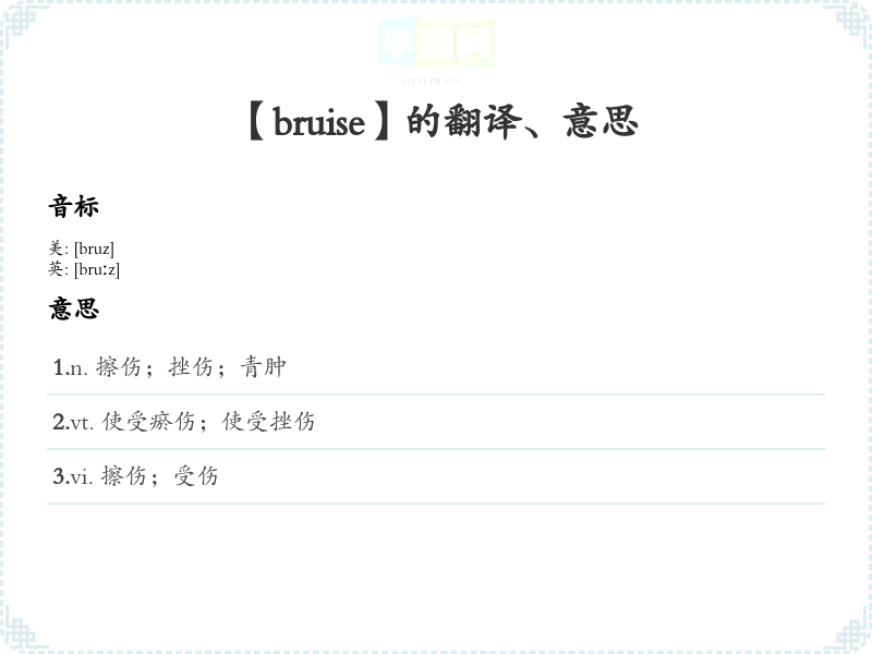 通过这些学方法和例句,学者可以更好地理解和运用“bruise”这个单词。