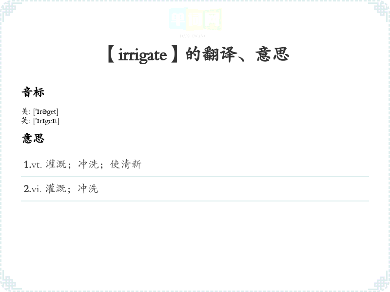 - 词根记忆法:理解“irrigate”由“in-”(向内)和“rigate”(灌溉)构成,可以帮助记忆其含义。想象水被引导到土地中,形成灌溉的图像。