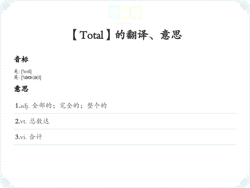 - 谐音联想记忆:可以想象“total”与“投到”的音似,想象把所有的东西都投到一个地方。