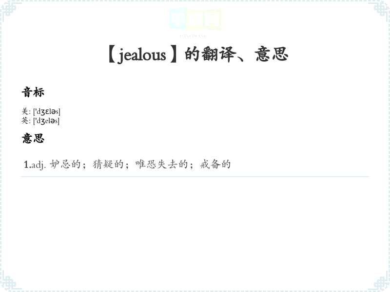 - 词根记忆法:将“jealous”与其拉丁词根“zelosus”联系,理解其情感根源。