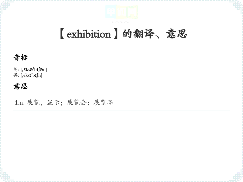 - 字面意思:"exhibition" 字面意思为展示或展出,指的是展示艺术品、商品或其他物品的活动或**。
