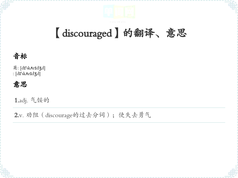 1.adj. 气馁的 2.v. 劝阻(discourage的过去分词);使失去勇气