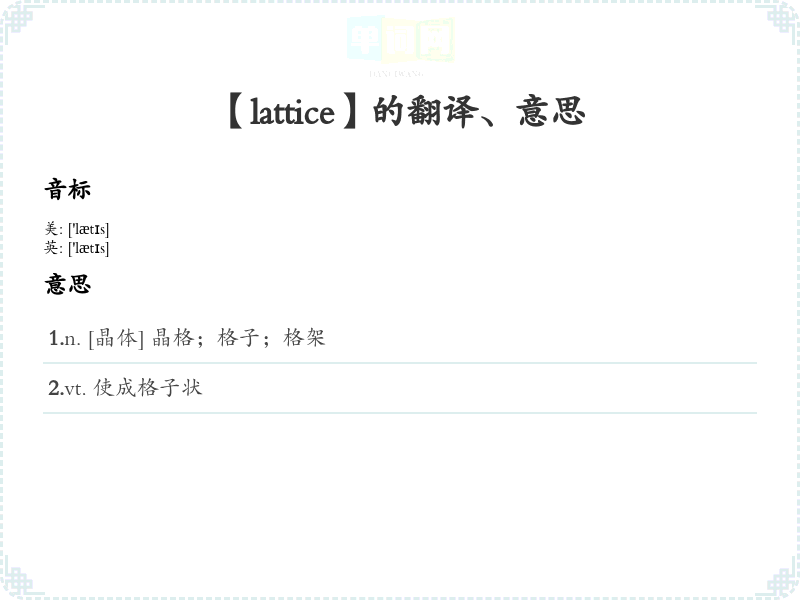 - 音标记忆法:Lattice /ˈlætɪs/。可以记住其发音,联想成“拉提斯”,想象一块网格状的木板,帮助记忆其结构含义。