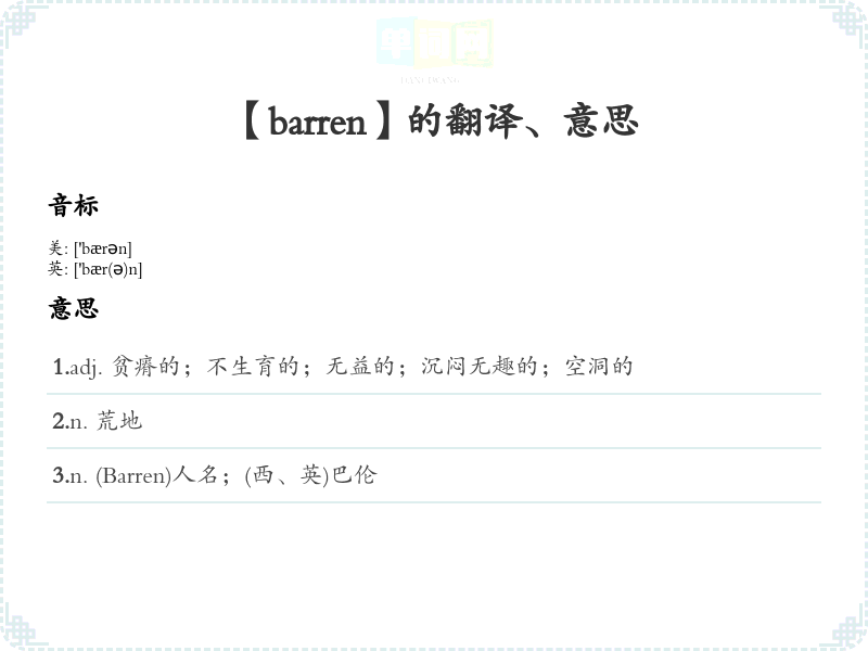 barren这个词的字面含义是“贫瘠的”或“不毛的”,通常用来描述土地或环境缺乏生机,无法生长植物。 - 词性:形容词(adjective)。