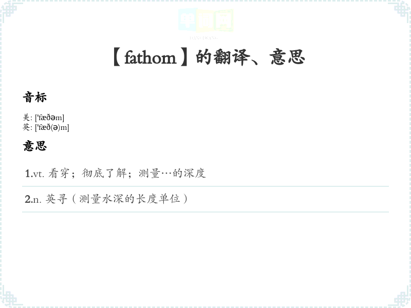 fathom字面意思是“测量深度”,通常指水的深度。引申义为“理解”或“领悟”某事物。 - 定义:作为动词,