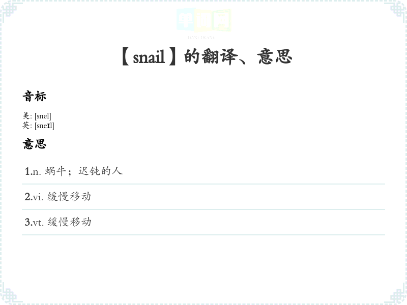 - 谐音联想记忆:可以将 "snail" 和 "慢"(慢的谐音)联想在一起,想象蜗牛缓慢爬行的画面,从而加深记忆。