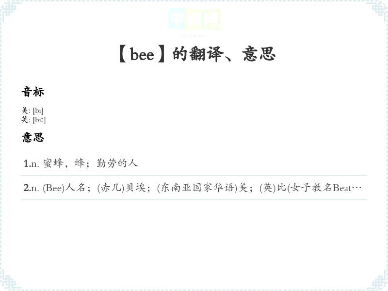- 音标记忆法:Bee的音标为/bɪː/。可以通过发音练*,将其与“see”相联系,想象看到蜜蜂在花间飞舞的场景。