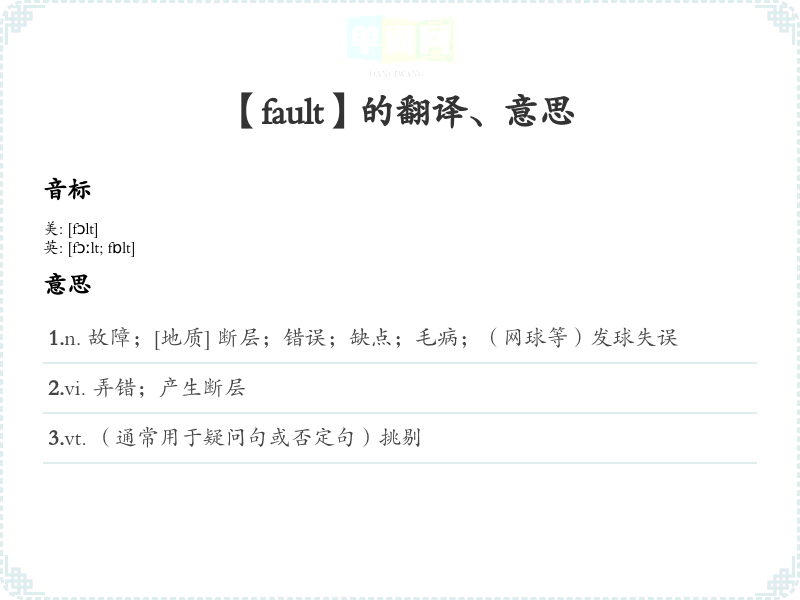以上是对“fault”这个单词的详细分析与学方法,希望对你学英语有所帮助!