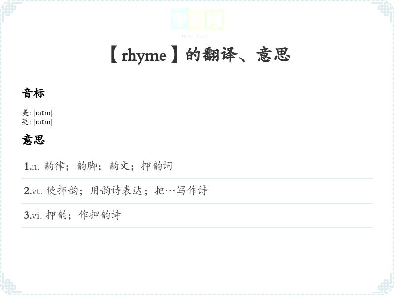 - 音标记忆法:学*rhyme的发音/raɪm/,通过反复朗读和声调模仿加深印象。