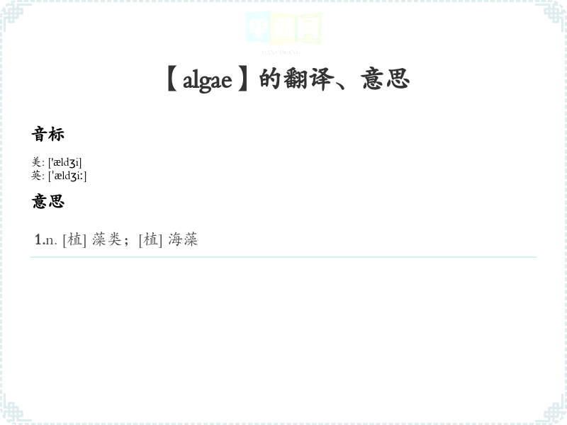 • 音标记忆法:可以将 "algae" 的发音记为 /ˈæl.dʒiː/,与“阿尔吉”类似,创建一个形象化的记忆连接。