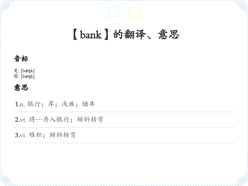 - 谐音联想记忆:可以联想“bank”与“绑”,如将钱“绑”在银行,来帮助记忆。