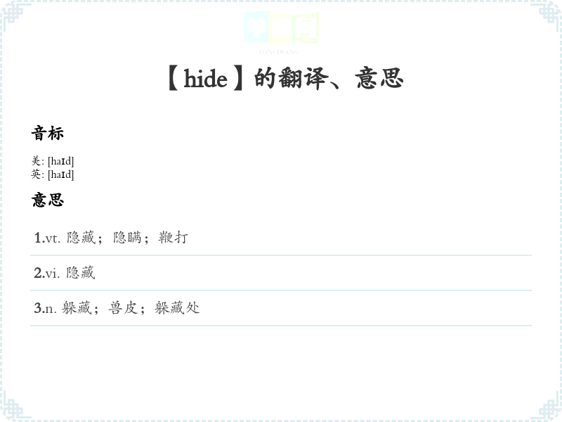 - 词性:动词(to hide);名词(a hide, 指掩蔽之处或隐蔽的地方)。