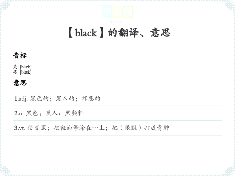 将“black”的音标 /blæk/ 划分为音节,反复朗读并结合视觉元素(如黑色图像),帮助记忆。 -