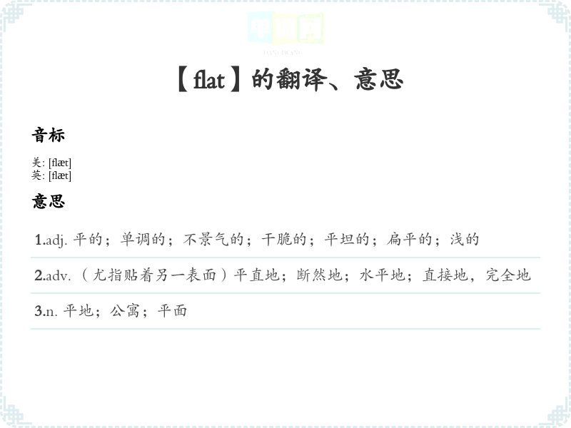 - 谐音联想记忆:可以联想到“平坦”(平=flat)来帮助记忆。