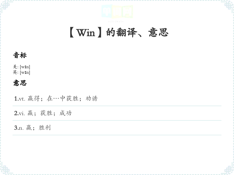 - 音标记忆法:通过记住发音 [wɪn],想象在比赛中赢得胜利时的欢呼声。