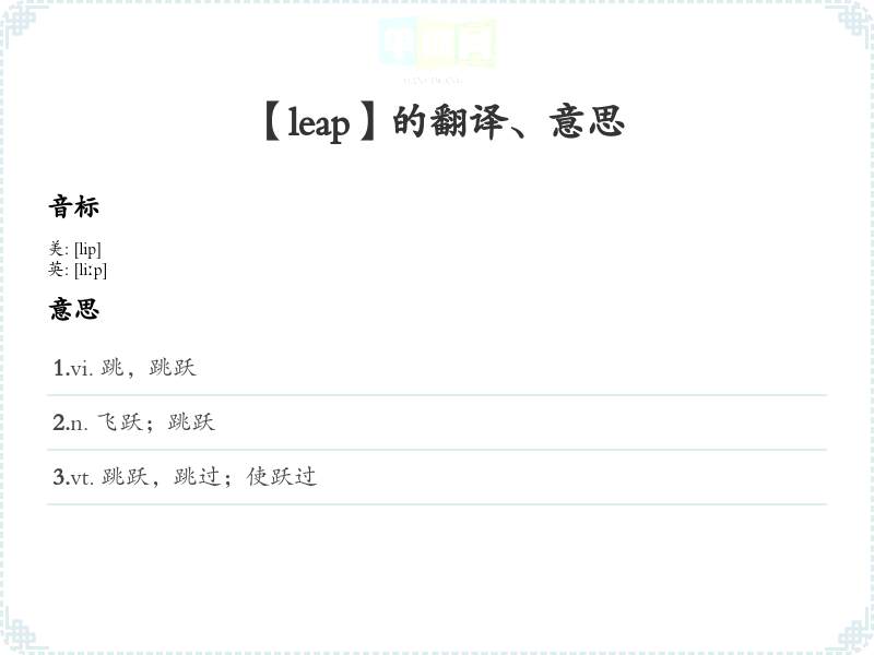 这种学*方法和内容分析有助于深入理解和掌握“leap”这个词,增强语言运用能力。