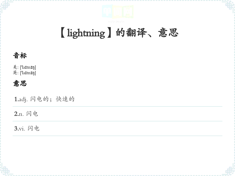 - 词根记忆法:记住“light”表示光,“ning”表示状态,结合理解“闪电是光的状态”。