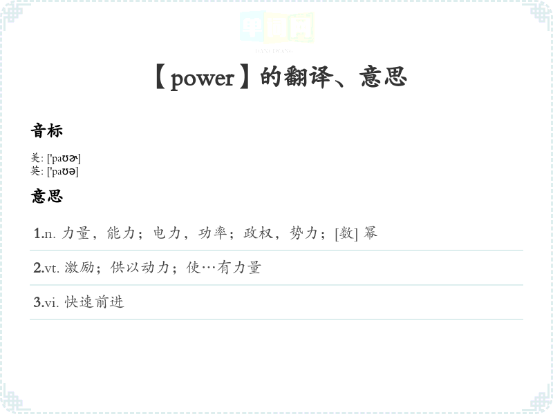- 音标记忆法:可以将“power”的发音记作/pɑːər/,联想为“强烈”的声音。