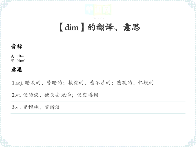 /dɪm/ 的发音与“沉闷”相似,可以联想为“昏暗的感觉”。 -