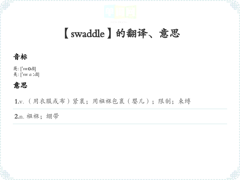 音标记忆法:/ˈswɒd.əl/,可以将其分为两个音节“swad-dle”,联想到“swaddle”的动作——用布包裹,创造一个图像帮助记忆。