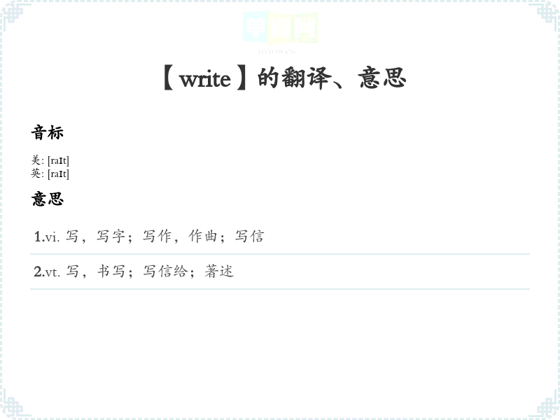 1.vi. 写,写字;写作,作曲;写信 2.vt. 写,书写;写信给;著述