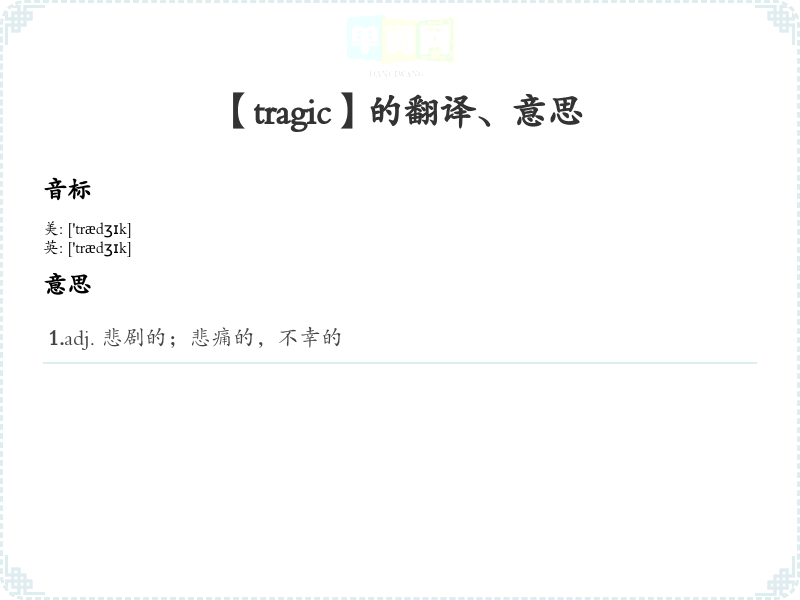 "Tragic" 源自拉丁语 "tragicus",又源于希腊语 "tragikos",意味着“悲剧的”,与 "tragōidia"(悲剧)有关。- 词根: