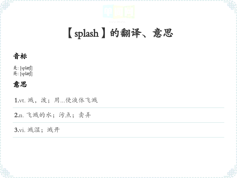 - 谐音联想记忆:可以将splash联想为“水飞溅”的声音,可以想象在一个池塘里扔石头,石头落水时发出的声音“扑通”就是splash的声音。