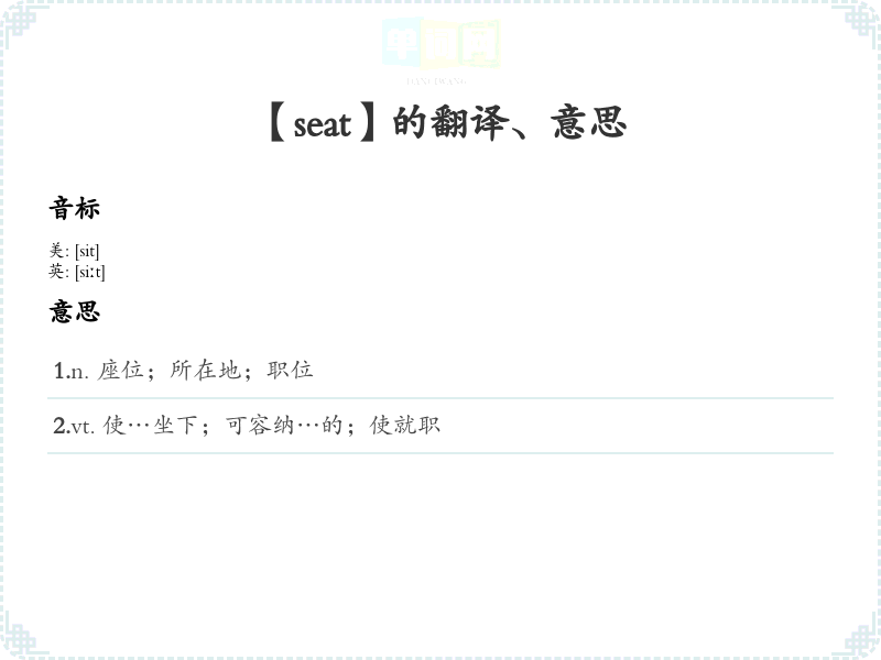 - 使用音标 /siːt/ 来帮助记忆发音,可以将其与“see”(看见)联系起来,想象一个“座位”上坐着一个人正在看东西。
