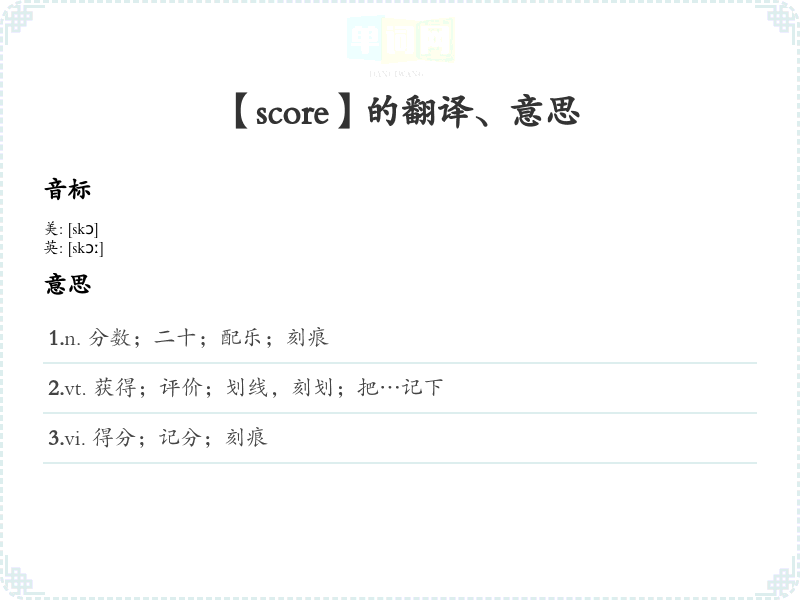 - 词源分析:Score源自古法语“escore”,意为“划痕”,最早指划分数量的标记,后来演变为表示分数的含义。词根“scor-”来自拉丁语“scoria”意为“划分”。