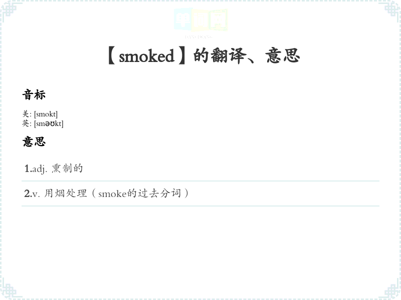 - 谐音联想记忆:可以将“smoked”联想为“烟的味道”,想象在篝火旁的场景,烟雾缭绕,味道浓郁。可以使用图像辅助记忆,如熏制食物的照片。