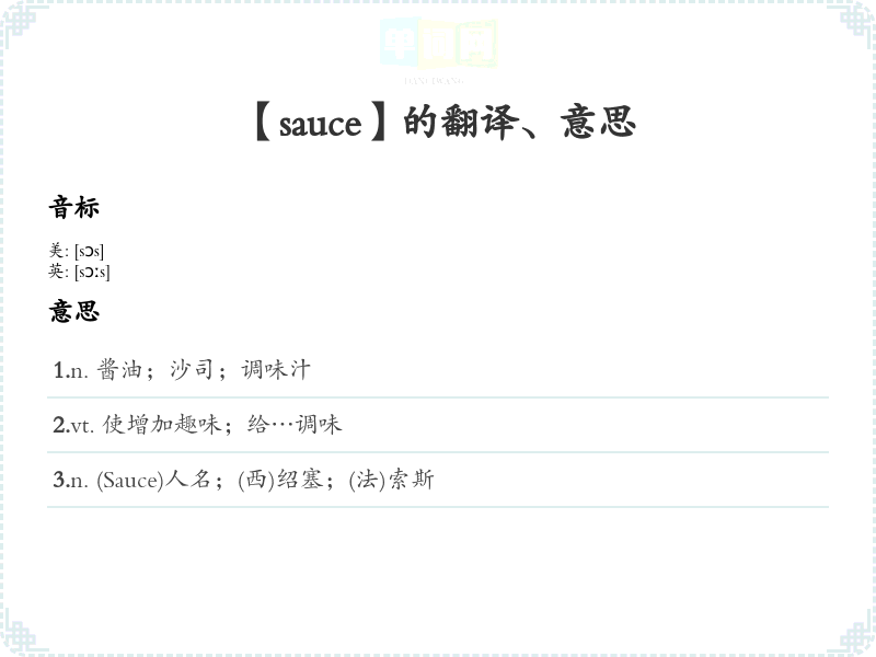 - 通过将音标与常见词汇相结合,比如“sauce”与“source”(来源)相似,帮助记忆其发音和含义。