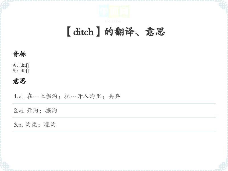 - 字面意思:Ditch的字面意思是“沟”或“排水沟”,通常指用于排水或引导水流的长而窄的开口。