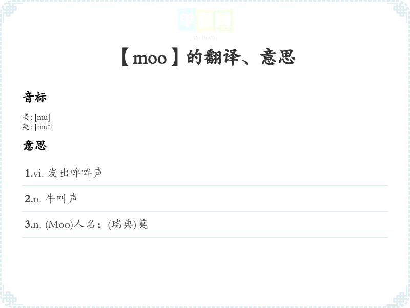 - 音标记忆法:将“moo”的发音与牛的叫声联系起来,反复朗读以加深记忆。