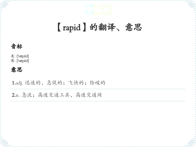 - 字面意思:rapid 这个单词的字面意思是“迅速的”或“快速的”,指发生或完成的速度很快。