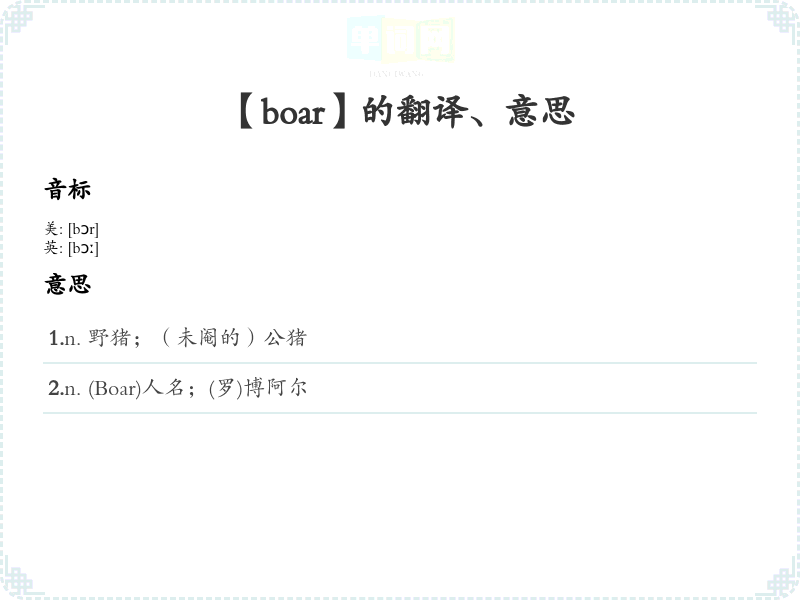 通过这种方式,我们可以更深入地理解和记忆“boar”这个词汇,增强我们在不同场合下的语言表达能力。