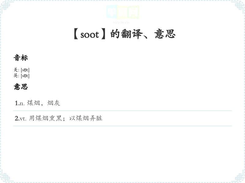 以上是对单词“soot”的详细学*与分析,希望能帮助你更好地理解和记忆这个词汇。