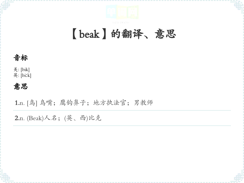 以上是关于单词"beak"的全面分析,希望对您的学*有所帮助!