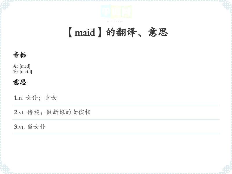 - 音标记忆法:/meɪd/,可以联想“made”,表示“制作”,帮助记忆为“做家务的人”。
