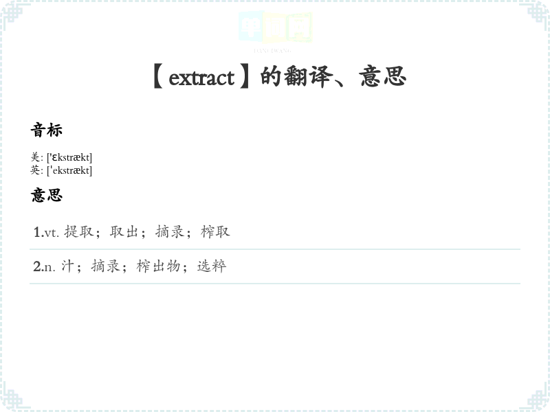 - 该词源自拉丁语“extractus”,由“ex-”(意为“从”)和“tractus”(意为“拉”或“拖”)组成。因此,extract 的字面意思可以理解为“拉出”或“从中去除”。