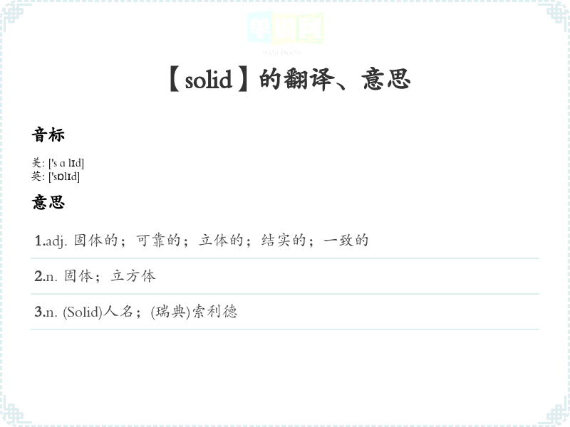 - "Solid" 的音标为 /ˈsɒlɪd/。可以通过反复朗读和拼写来加深印象。