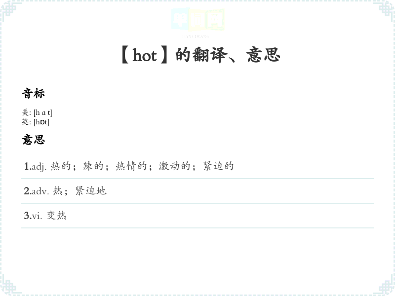 “Hot”字面意思是“热的”,通常指温度高的状态。它也可以用来形容某物在感情、性格或流行程度上的“火热”。 - 词性:
